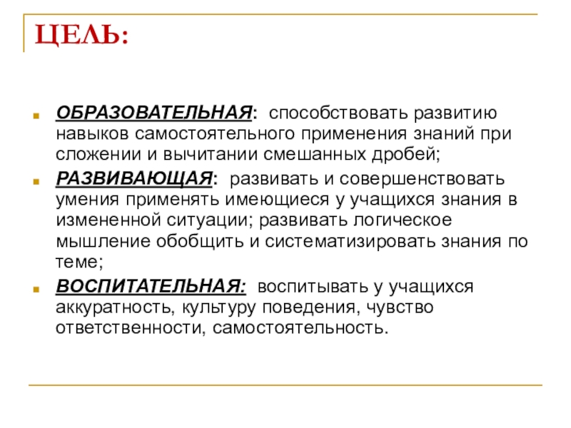 ЦЕЛЬ: ОБРАЗОВАТЕЛЬНАЯ: способствовать развитию навыков самостоятельного применения знаний при сложении и вычитании смешанных дробей;РАЗВИВАЮЩАЯ: развивать и совершенствовать умения применять имеющиеся у учащихся знания в измененной ситуации; развивать логическое мышление обобщить и систематизировать знания по теме;ВОСПИТАТЕЛЬНАЯ: