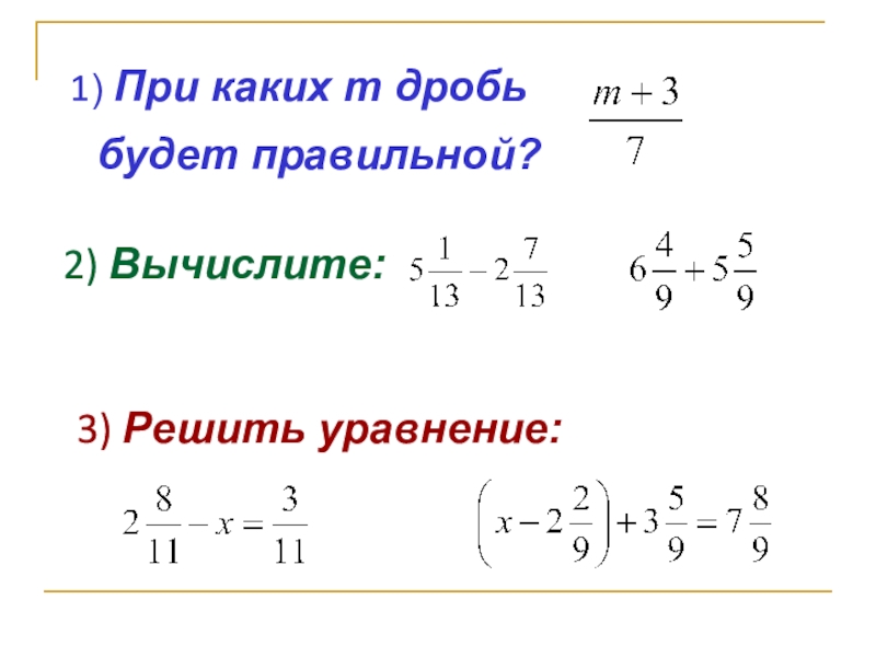 1) При каких m дробь будет правильной?2) Вычислите: 3) Решить уравнение: