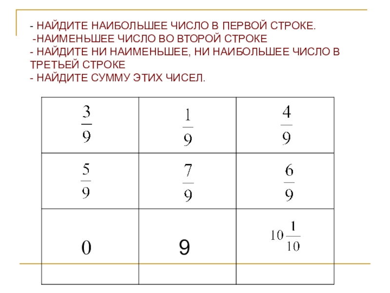 - НАЙДИТЕ НАИБОЛЬШЕЕ ЧИСЛО В ПЕРВОЙ СТРОКЕ. -НАИМЕНЬШЕЕ ЧИСЛО ВО ВТОРОЙ СТРОКЕ- НАЙДИТЕ НИ НАИМЕНЬШЕЕ, НИ НАИБОЛЬШЕЕ