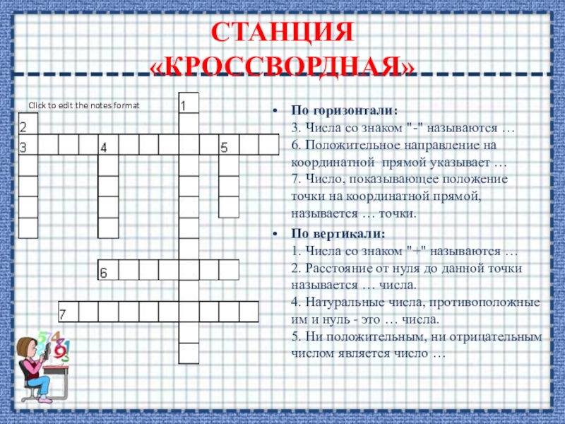 По вертикали: 1. Числа со знаком "+" называются … 2. Расстояние от нуля до данной точки называется … числа. 4. Натуральные числа, противоположные им и нуль - это … числа. 5. Ни положительным, ни отрицательным числом является число …