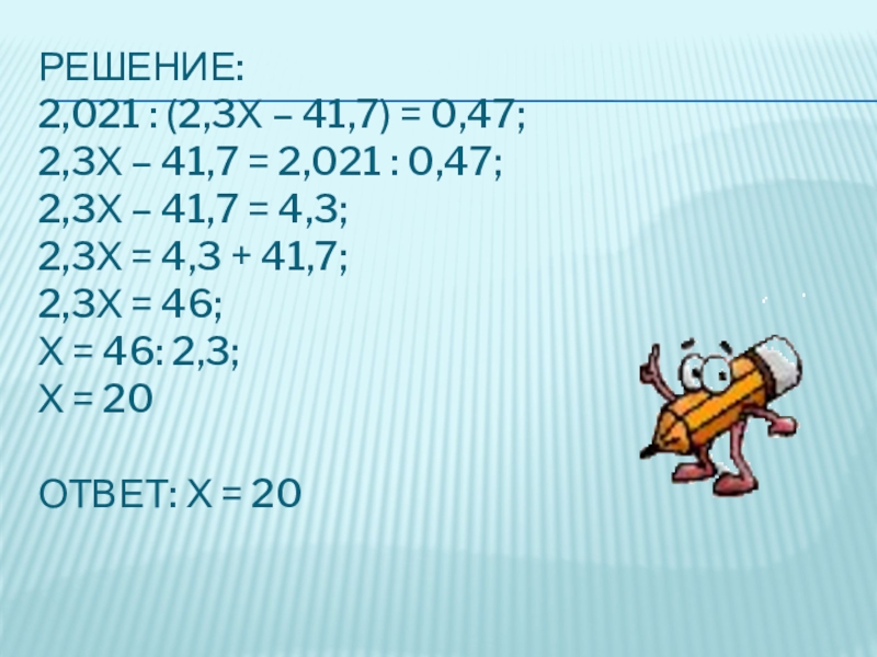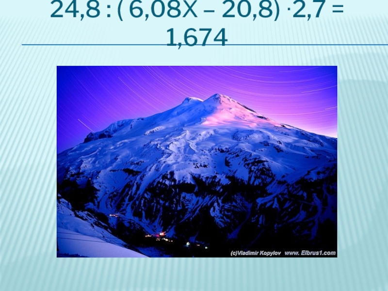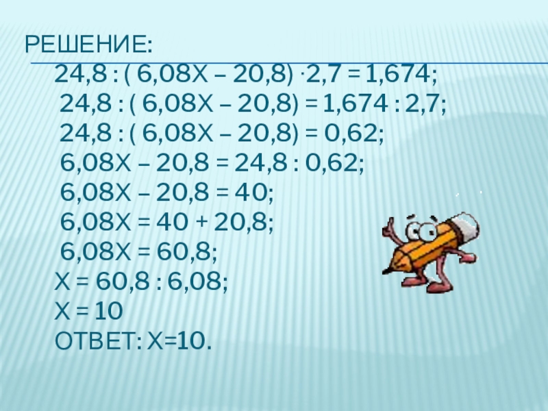 Слайд 6624,8 : ( 6,08х – 20,8) ∙2,7 = 1,674
