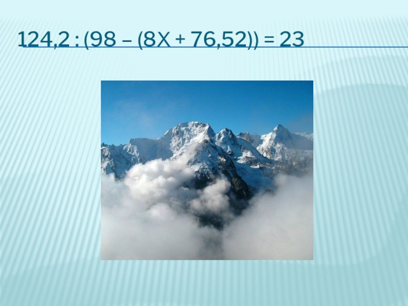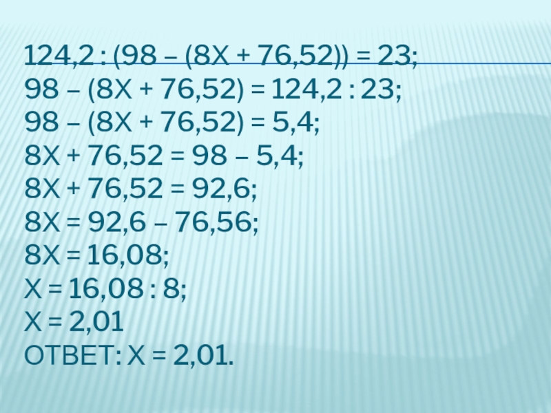 Слайд 68124,2 : (98 – (8х + 76,52)) = 23