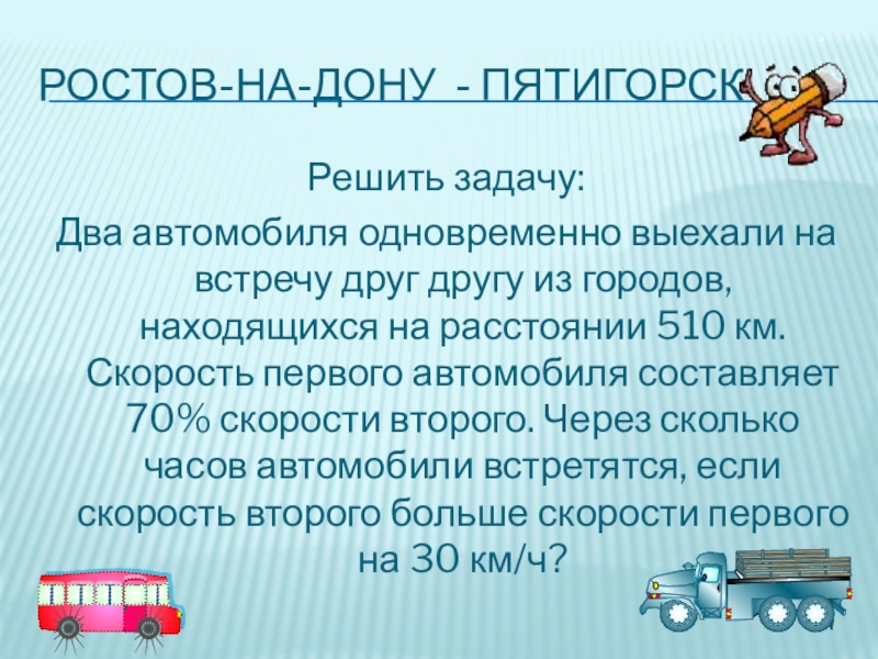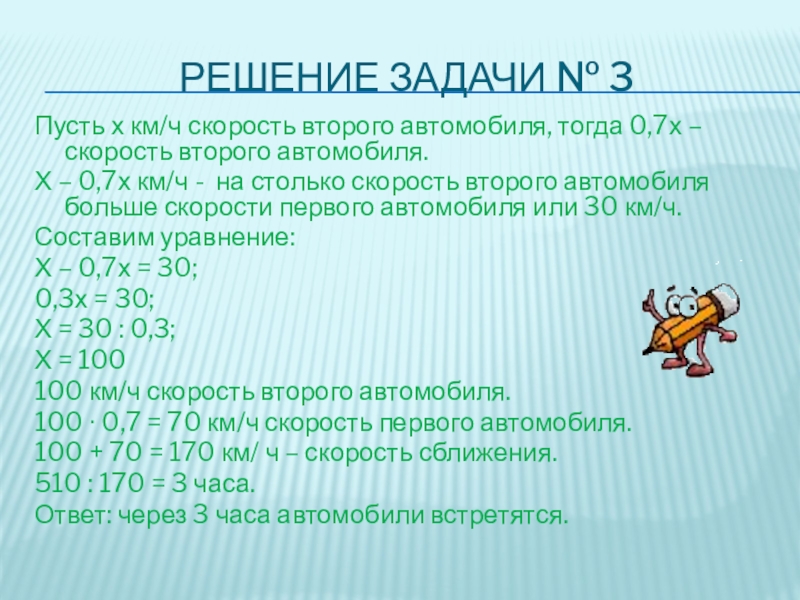 Х – 0,7х км/ч - на столько скорость второго автомобиля больше скорости первого автомобиля или 30 км/ч.