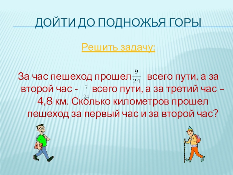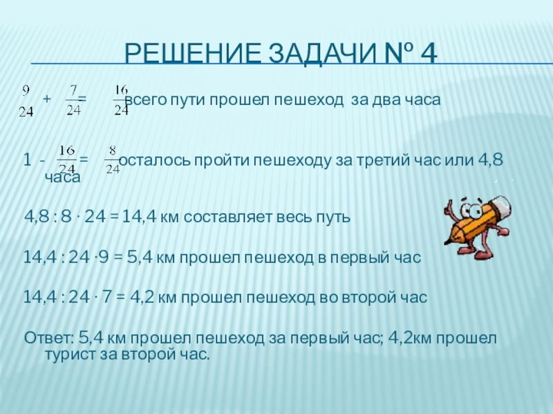 1 - = осталось пройти пешеходу за третий час или 4,8 часа