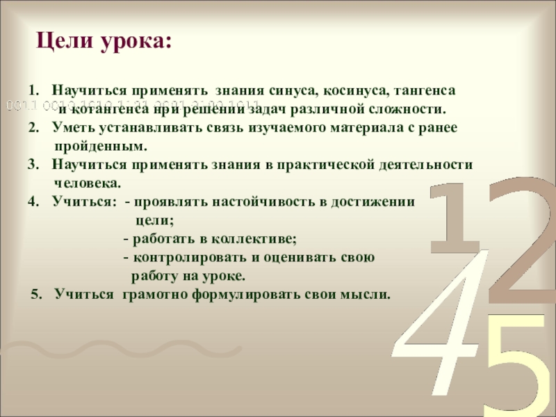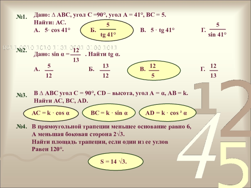sin 45° 2. cos 30° 3. tg 60° 4. ctg45°