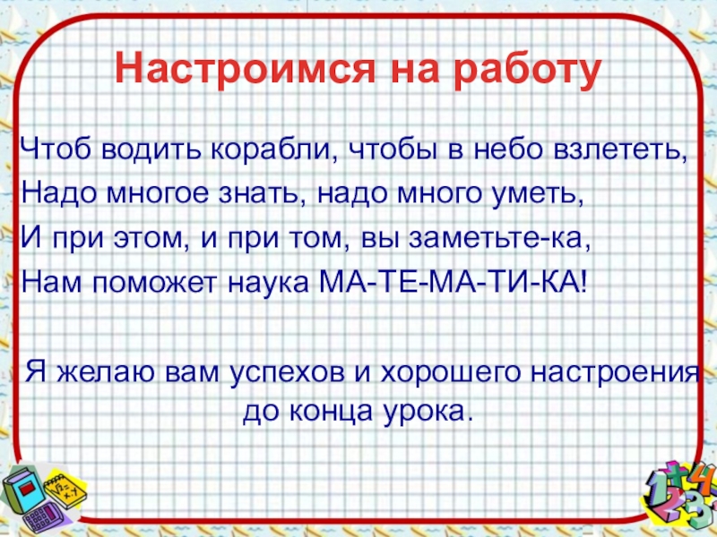 Настроимся на работуЧтоб водить корабли, чтобы в небо взлететь, Надо многое знать, надо много уметь,И при этом, и при том, вы заметьте-ка,Нам поможет наука МА-ТЕ-МА-ТИ-КА!Я желаю вам успехов и хорошего настроения до конца урока.