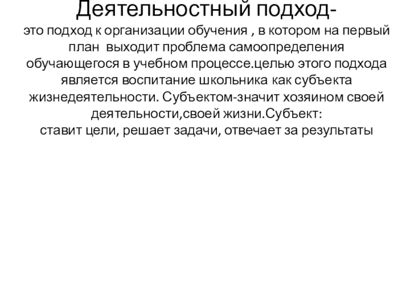 план выходит проблема самоопределения обучающегося в учебном процессе.целью этого подхода является воспитание школьника как субъекта жизнедеятельности. Субъектом-значит хозяином своей деятельности,своей жизни.Субъект: