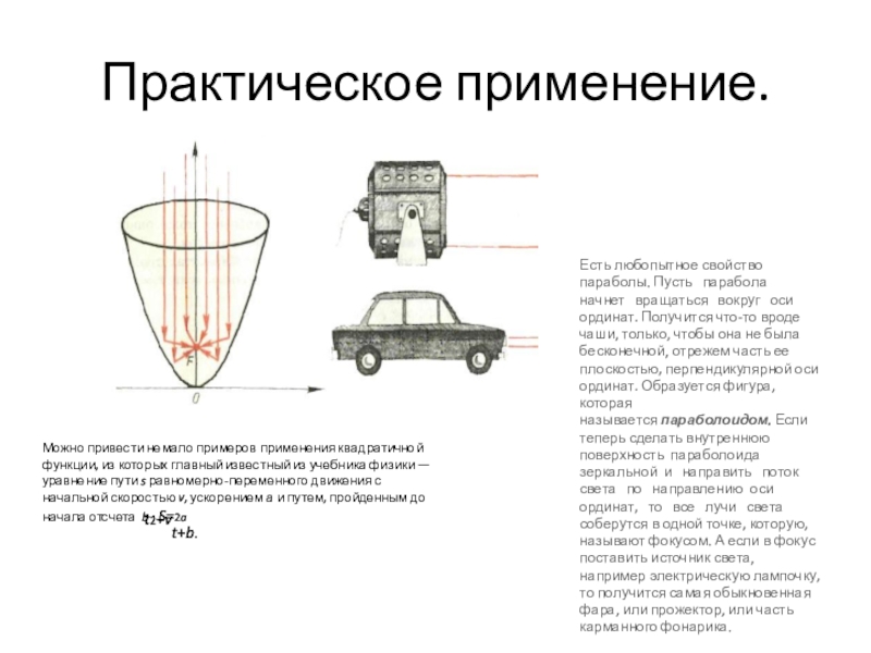 Есть любопытное свойство параболы. Пусть парабола начнет вращаться вокруг оси ординат. Получится что-то вроде чаши, только, чтобы она не была бесконечной, отрежем часть ее плоскостью, перпендикулярной оси ординат. Образуется фигура, которая называется параболоидом. Если теперь сделать внутреннюю поверхность параболоида зеркальной и направить поток света по направлению оси ординат, то все лучи света соберутся в одной точке, которую, называют фокусом. А если в фокус поставить источник света, например электрическую лампочку, то получится самая обыкновенная фара, или прожектор, или часть карманного фонарика.