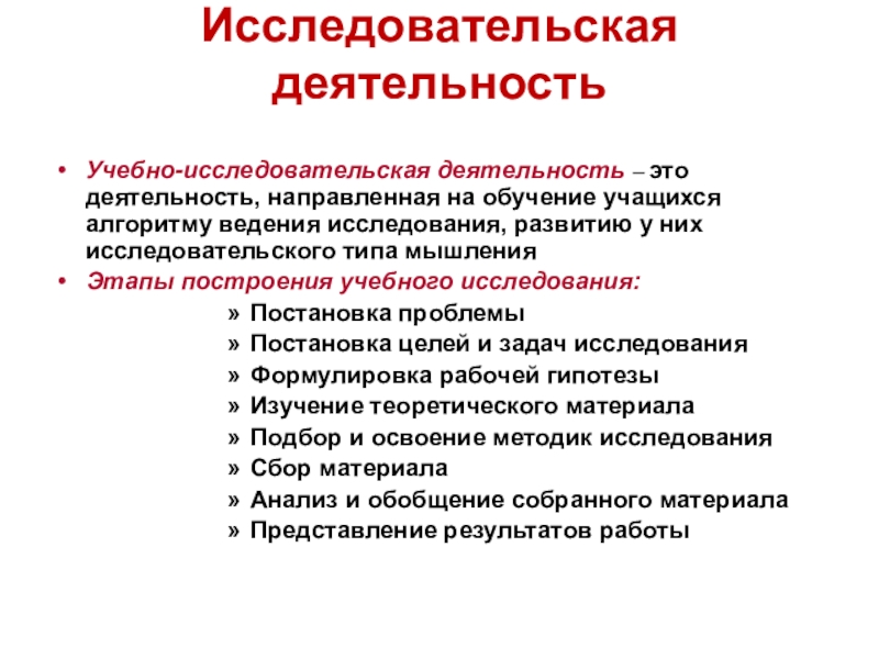 Учебно-исследовательская деятельность – это деятельность, направленная на обучение учащихся алгоритму