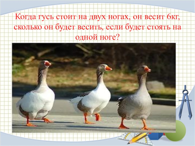 Слайд 14Когда гусь стоит на двух ногах, он весит 6кг, сколько он