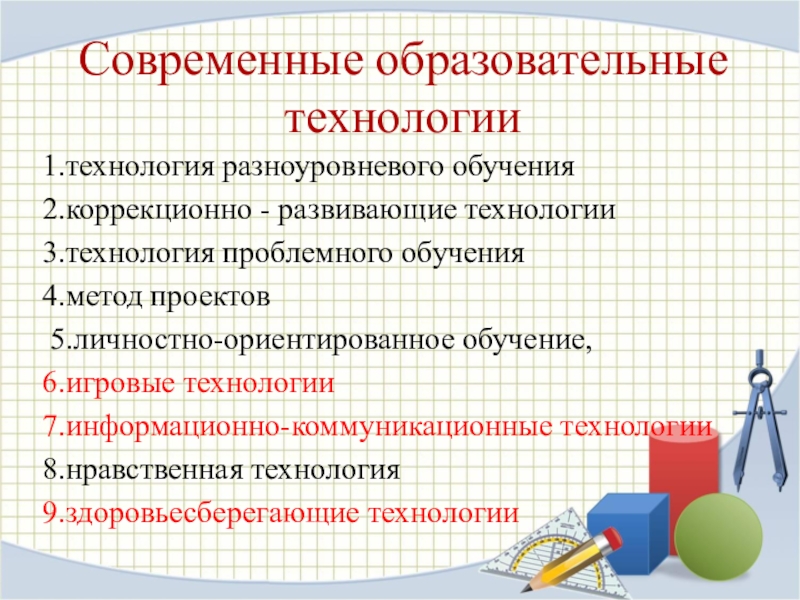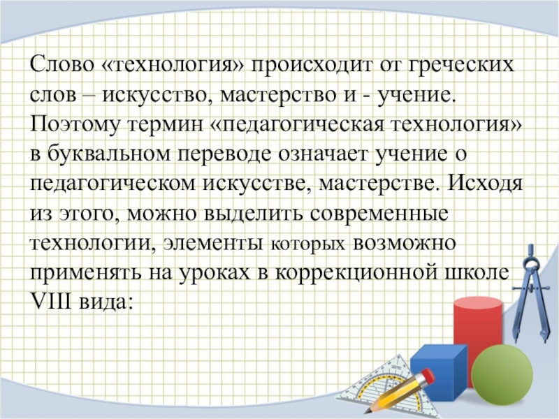 учение. Поэтому термин «педагогическая технология» в буквальном переводе означает учение о педагогическом искусстве, мастерстве. Исходя из этого, можно выделить современные технологии, элементы которых возможно применять на уроках в коррекционной школе VIII вида: