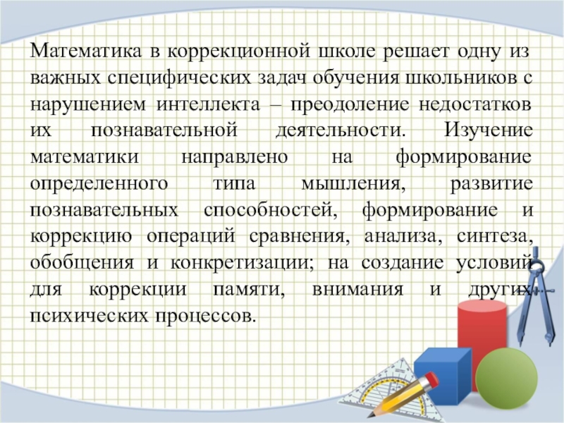 Слайд 2Математика в коррекционной школе решает одну из важных специфических задач обучения