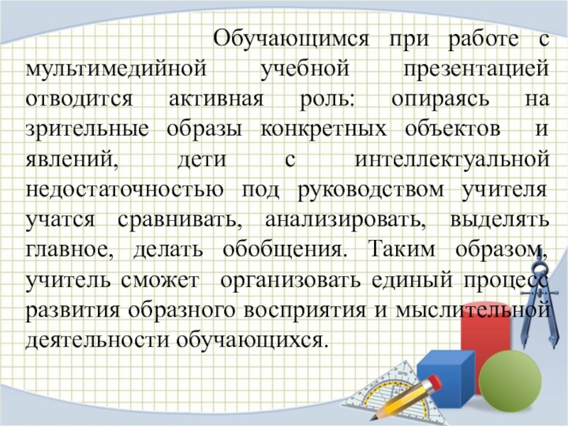 презентацией отводится активная роль: опираясь на зрительные образы конкретных объектов и явлений, дети с интеллектуальной недостаточностью под руководством учителя учатся сравнивать, анализировать, выделять главное, делать обобщения. Таким образом, учитель сможет организовать единый процесс развития образного восприятия и мыслительной деятельности обучающихся.