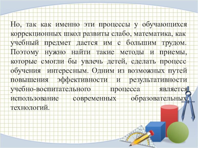 Слайд 3Но, так как именно эти процессы у обучающихся коррекционных школ развиты