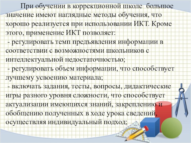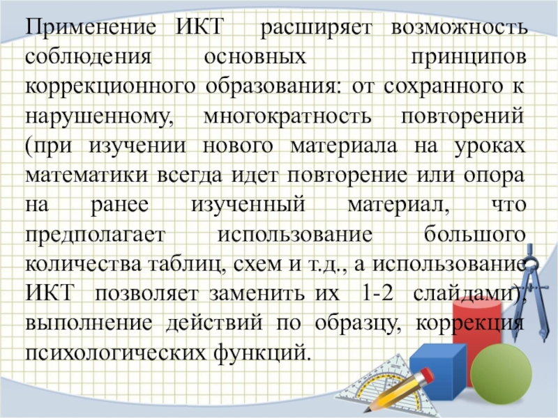 к нарушенному, многократность повторений (при изучении нового материала на уроках математики всегда идет повторение или опора на ранее изученный материал, что предполагает использование большого количества таблиц, схем и т.д., а использование ИКТ позволяет заменить их 1-2 слайдами), выполнение действий по образцу, коррекция психологических функций.