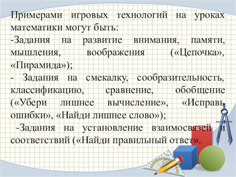 Слайд 7Примерами игровых технологий на уроках математики могут быть: