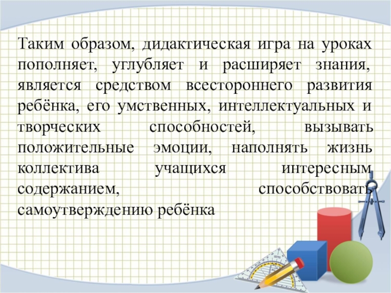 Слайд 8Таким образом, дидактическая игра на уроках пополняет, углубляет и расширяет знания,