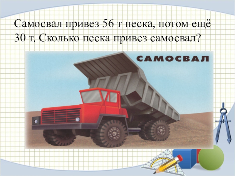 Слайд 19Самосвал привез 56 т песка, потом ещё 30 т. Сколько песка