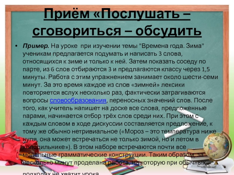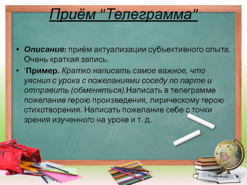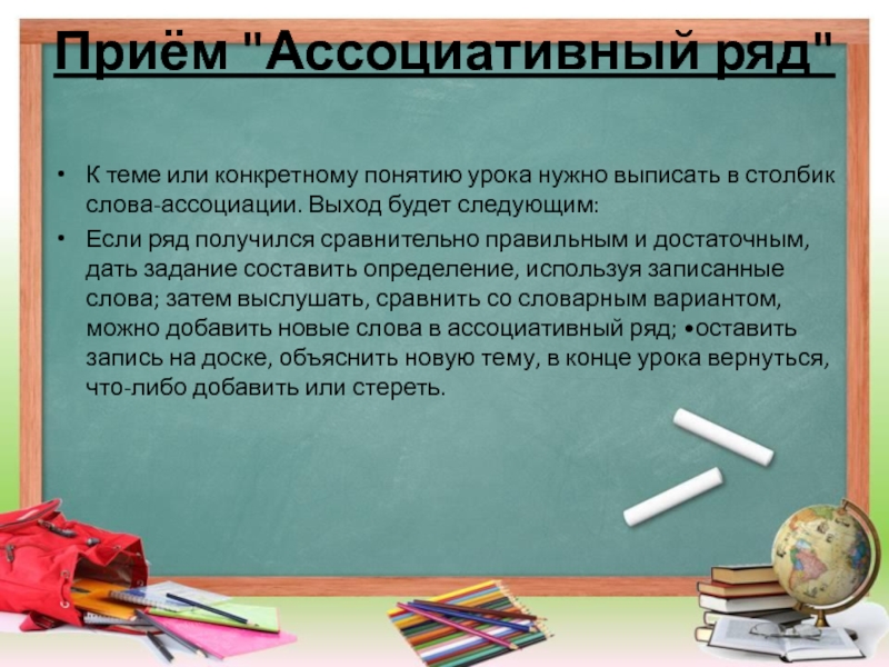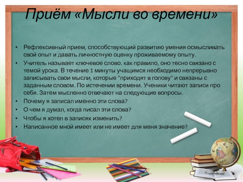 Учитель называет ключевое слово. как правило, оно тесно связано с темой урока. В течение 1 минуты учащимся необходимо непрерывно записывать свои мысли, которые "приходят в голову" и связаны с заданным словом. По истечении времени. Ученики читают записи про себя. Затем мысленно отвечают на следующие вопросы.