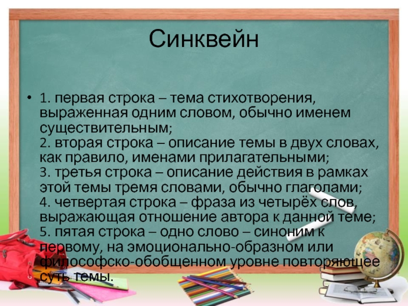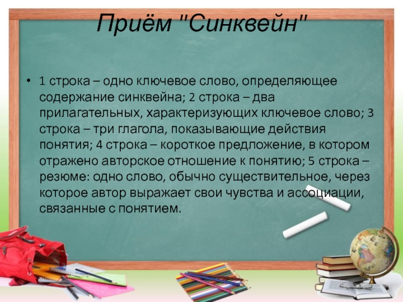 строка – два прилагательных, характеризующих ключевое слово; 3 строка – три глагола, показывающие действия понятия; 4 строка – короткое предложение, в котором отражено авторское отношение к понятию; 5 строка – резюме: одно слово, обычно существительное, через которое автор выражает свои чувства и ассоциации, связанные с понятием.