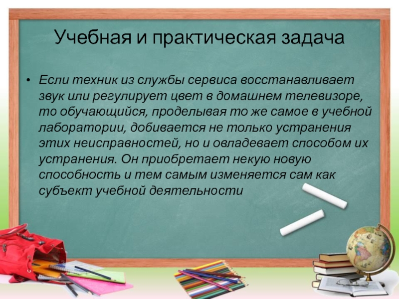 регулирует цвет в домашнем телевизоре, то обучающийся, проделывая то же самое в учебной лаборатории, добивается не только устранения этих неисправностей, но и овладевает способом их устранения. Он приобретает некую новую способность и тем самым изменяется сам как субъект учебной деятельности