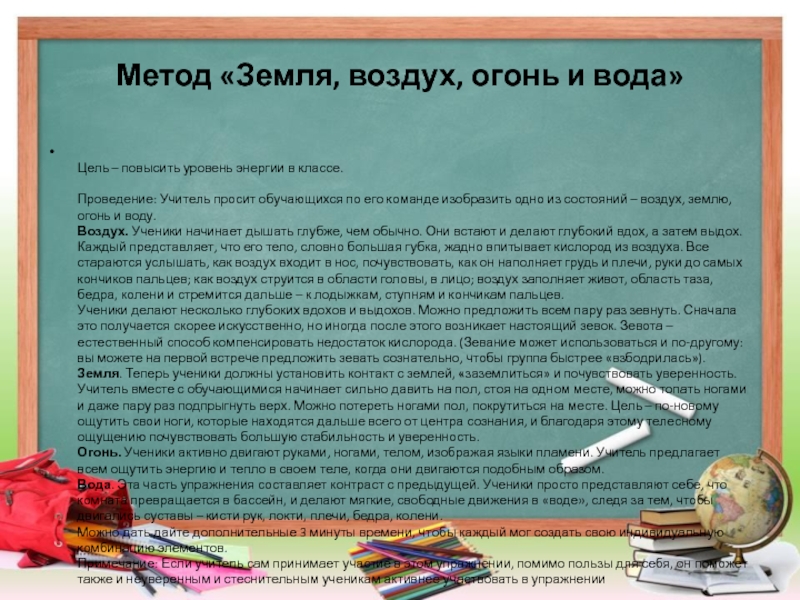 Проведение: Учитель просит обучающихся по его команде изобразить одно из состояний – воздух, землю, огонь и воду.