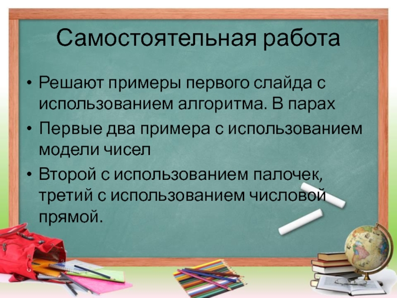 Решают примеры первого слайда с использованием алгоритма. В парах
