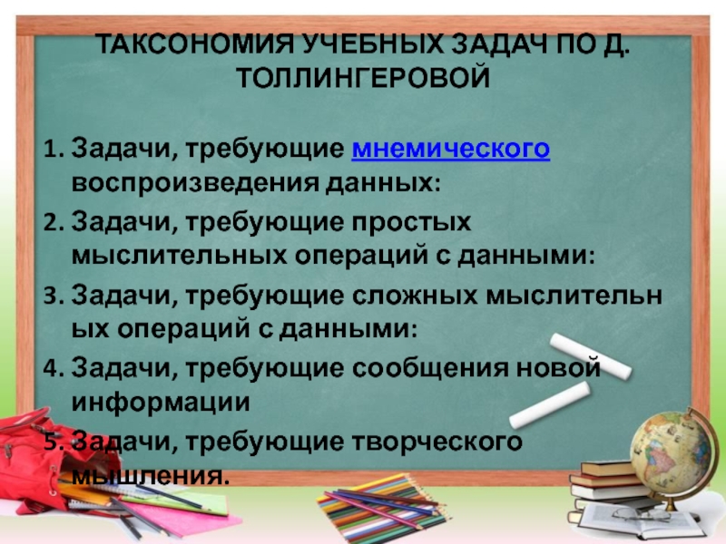 Слайд 20ТАКСОНОМИЯ УЧЕБНЫХ ЗАДАЧ ПО Д. ТОЛЛИНГЕРОВОЙ