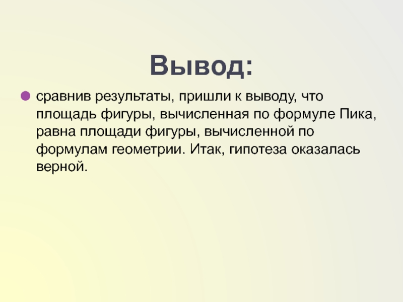 Пика, равна площади фигуры, вычисленной по формулам геометрии. Итак, гипотеза оказалась верной.