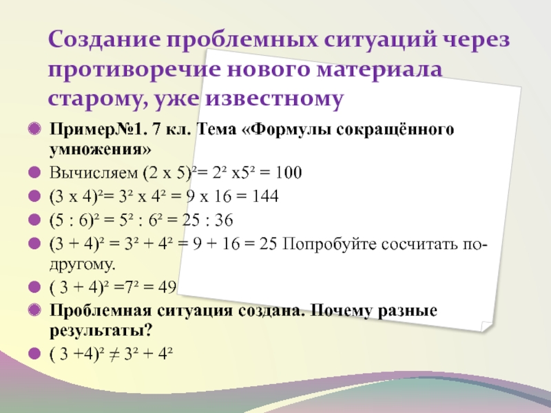 Слайд 16Создание проблемных ситуаций через противоречие нового материала старому, уже известному