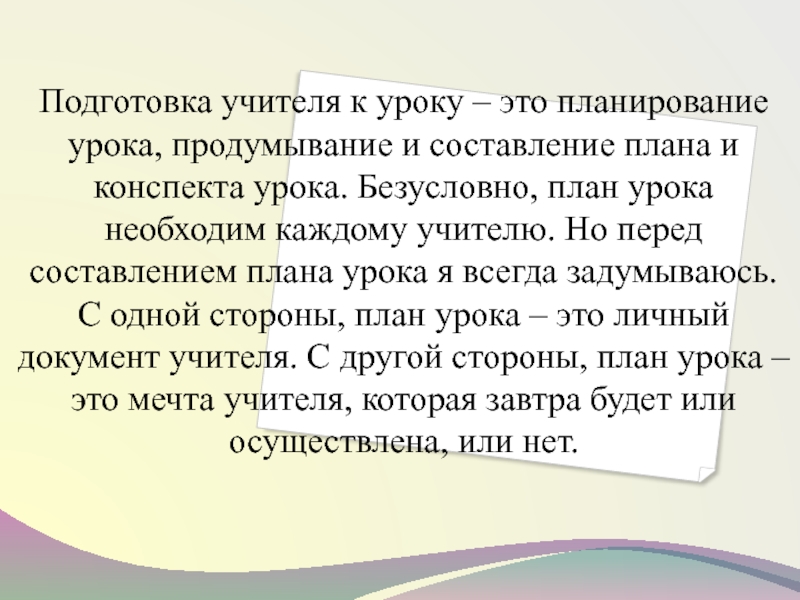 плана и конспекта урока. Безусловно, план урока необходим каждому учителю. Но перед составлением плана урока я всегда задумываюсь. С одной стороны, план урока – это личный документ учителя. С другой стороны, план урока – это мечта учителя, которая завтра будет или осуществлена, или нет.