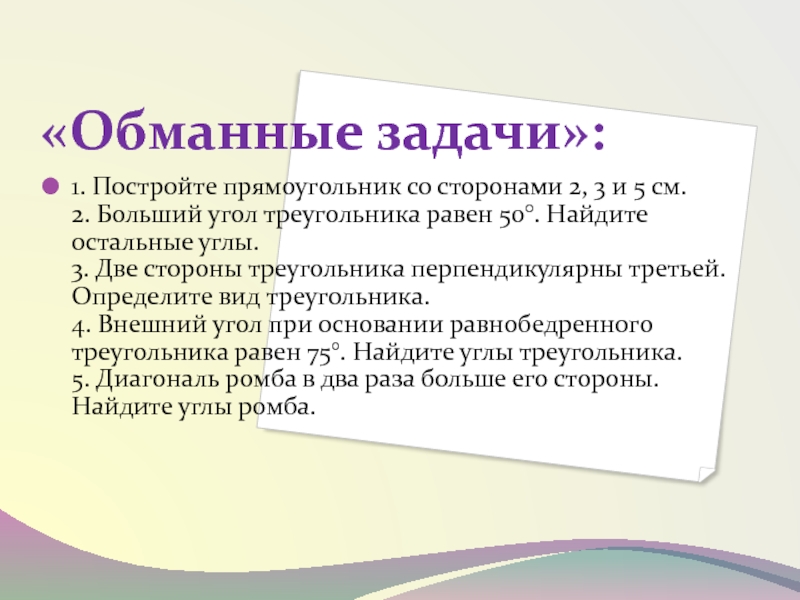 Ребята работают самостоятельно и приходят к тому, что построить треугольник в последних двух примерах не удается.