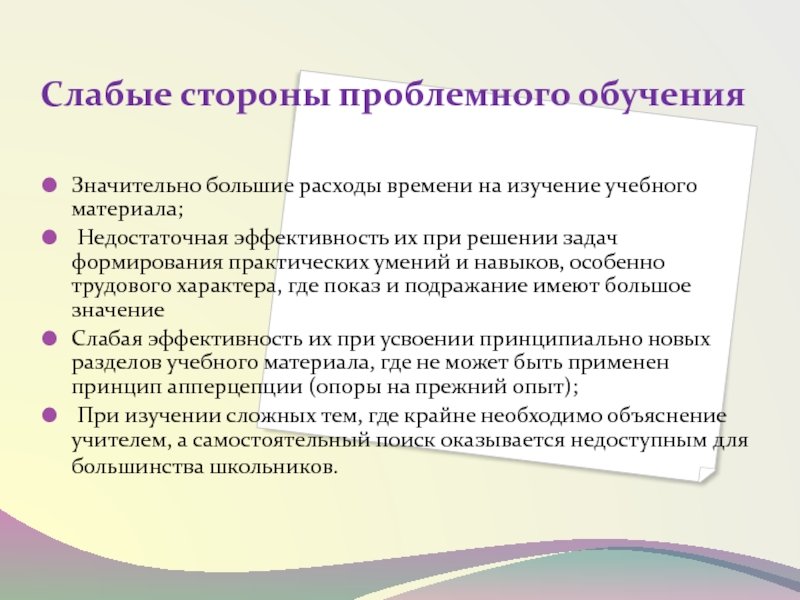 Слабая эффективность их при усвоении принципиально новых разделов учебного материала, где не может быть применен принцип апперцепции (опоры на прежний опыт);