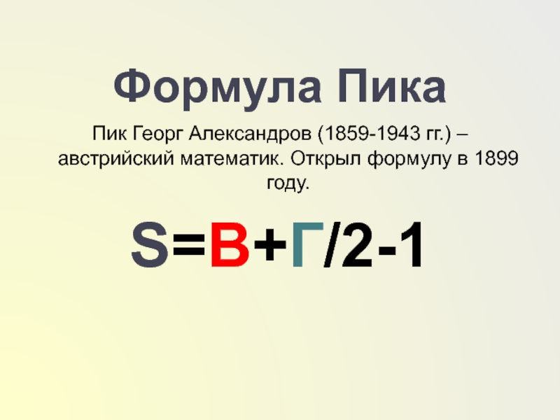 Пик Георг Александров (1859-1943 гг.) – австрийский математик. Открыл формулу