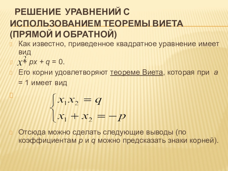 Его корни удовлетворяют теореме Виета, которая при а = 1 имеет вид