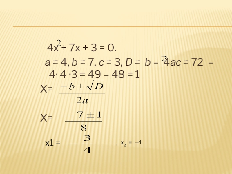 а = 4, b = 7, с = 3, D = b – 4ас = 72 – 4· 4 ·3 = 49 – 48 = 1