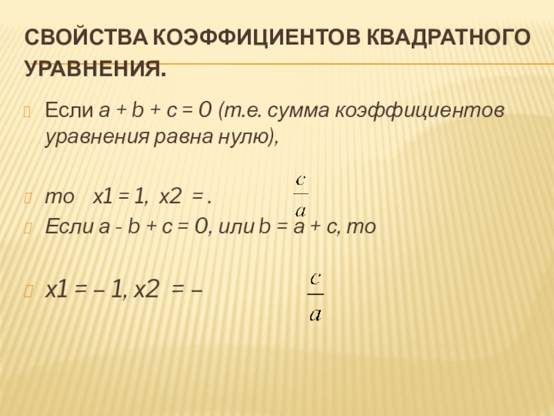 Слайд 18Свойства коэффициентов квадратного уравнения.