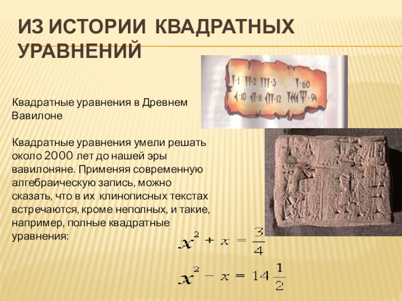 решать около 2000 лет до нашей эры вавилоняне. Применяя современную алгебраическую запись, можно сказать, что в их клинописных текстах встречаются, кроме неполных, и такие, например, полные квадратные уравнения: