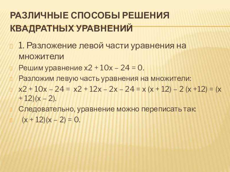 х2 + 10х – 24 = х2 + 12х – 2х – 24 = х (х + 12) – 2 (х +12) = (х + 12)(х – 2).