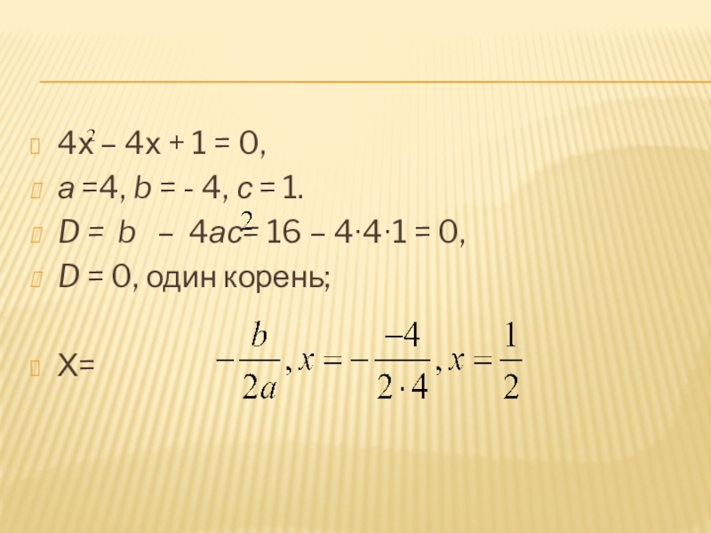D = b – 4ас= 16 – 4∙4∙1 = 0,
