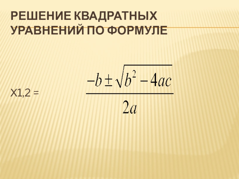 формула для решения квадратного уравнения с помощью радикалов (корней). Вывод формулы имеется у Виета,но он признавал только положительные корни. Итальянские математики Тарталья, Кордано, Бомбелли в XVI в.учитывают и отрицательные корни. В XVII в. благодаря трудам Жирара, Декарта, Ньютона способ решения квадратных уравнений принимает современный вид.