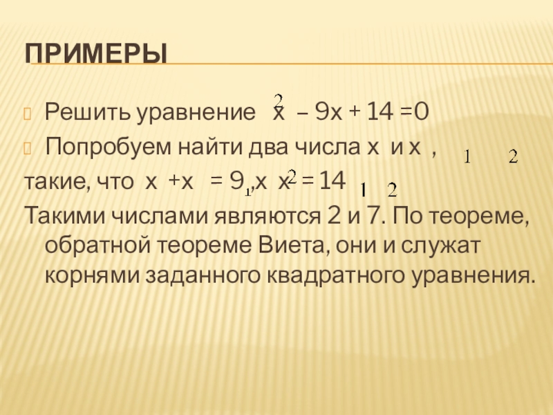 Такими числами являются 2 и 7. По теореме, обратной теореме Виета, они и служат корнями заданного квадратного уравнения.