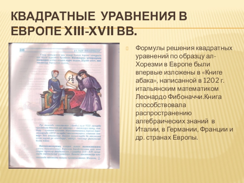 образцу ал-Хорезми в Европе были впервые изложены в «Книге абака», написанной в 1202 г. итальянским математиком Леонардо Фибоначчи.Книга способствовала распространению алгебраических знаний в Италии, в Германии, Франции и др. странах Европы.
