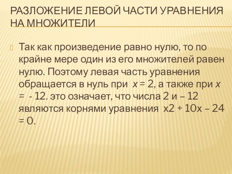то по крайне мере один из его множителей равен нулю. Поэтому левая часть уравнения обращается в нуль при х = 2, а также при х = - 12. это означает, что числа 2 и – 12 являются корнями уравнения х2 + 10х – 24 = 0.