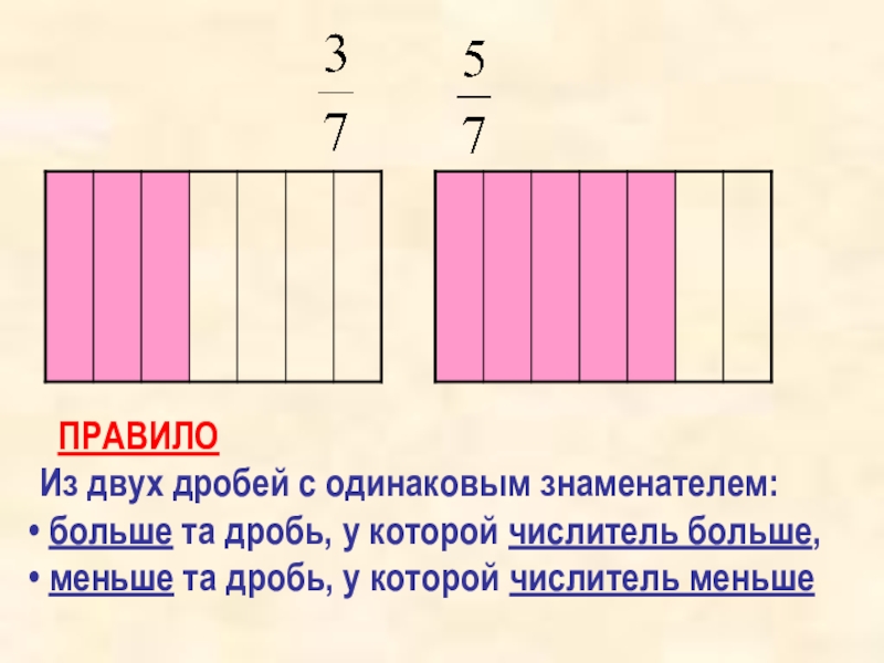 ПРАВИЛОИз двух дробей с одинаковым знаменателем: больше та дробь, у которой числитель больше, меньше та дробь,