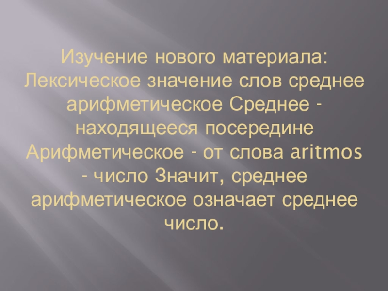 Изучение нового материала: Лексическое значение слов среднее арифметическое Среднее - находящееся посередине Арифметическое - от слова aritmos