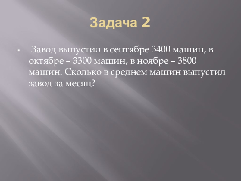 Задача 2 Завод выпустил в сентябре 3400 машин, в октябре – 3300 машин, в ноябре – 3800 машин.