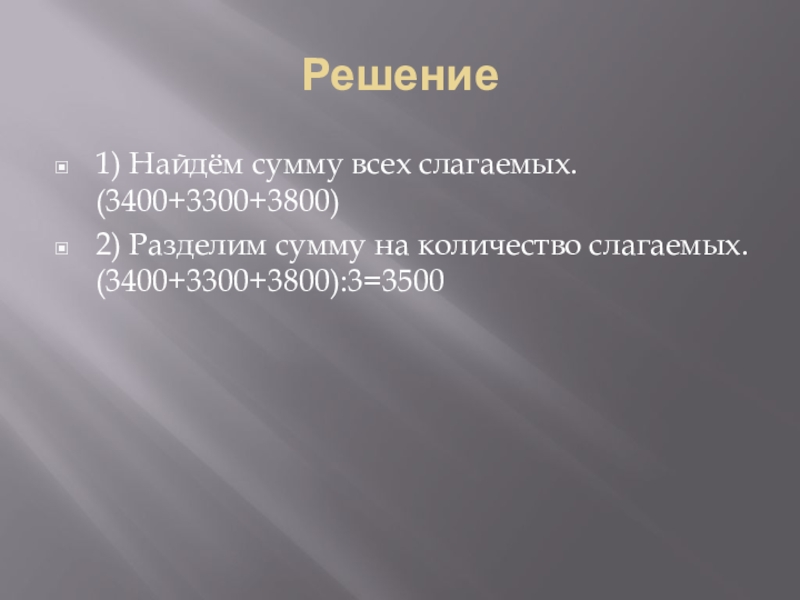 Решение1) Найдём сумму всех слагаемых. (3400+3300+3800)2) Разделим сумму на количество слагаемых. (3400+3300+3800):3=3500