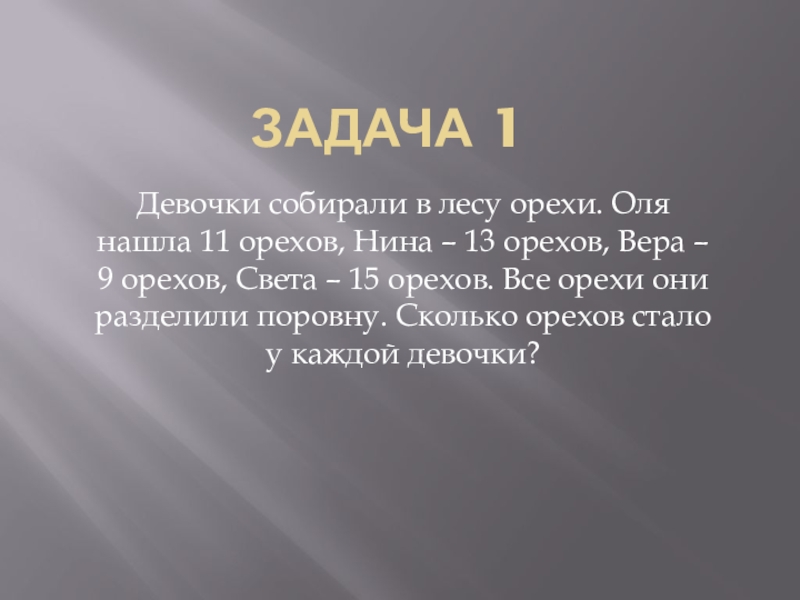 Задача 1Девочки собирали в лесу орехи. Оля нашла 11 орехов, Нина – 13 орехов, Вера – 9