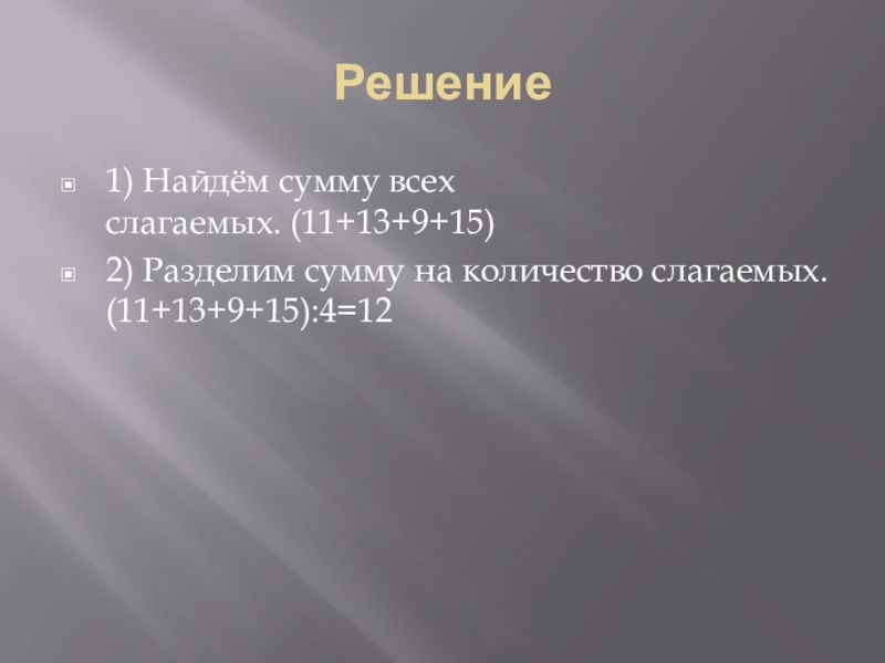 Решение1) Найдём сумму всех слагаемых. (11+13+9+15)2) Разделим сумму на количество слагаемых. (11+13+9+15):4=12